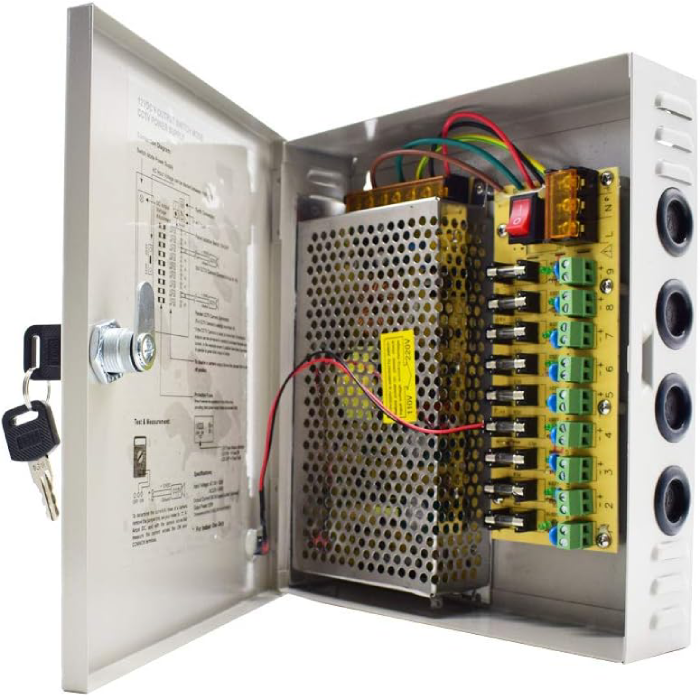 - გამომავალი ძაბვა: DC 12V, 9 არხის გამომავალი. შესაძლებელია 5 კამერამდე მიერთება მაქსიმალური დენის 2A გამომავალი სიმძლავრით.
